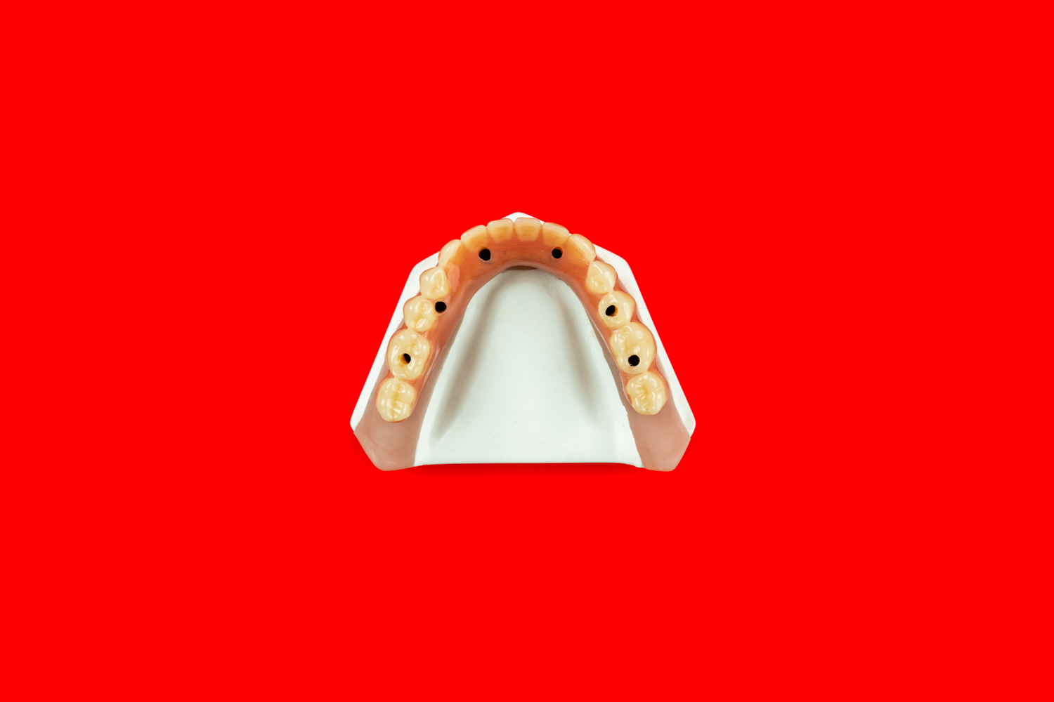 Notre bridge en résine sur pilotis est composé d’une armature métallique légère et résistante et de 12 à 14 dents en résine implantées sur une fausse gencive en résine. L’armature métallique est confectionnée de façon traditionnelle ou usinée par CFAO. La prothèse dentaire est transvissée sur 4 ou 6 implants préalablement posés. La résine, matériau poreux, possède une durée de vie d’environ 10 ans. Cette prothèse dentaire implanto-portée implique donc d’être changée régulièrement. Les réparations sur ce type de bridge pilotis sont facilitées grâce au dévissage de la prothèse et au remplacement possible des dents en résine.